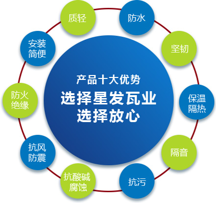 公司主要產(chǎn)品有《星發(fā)牌》合成樹(shù)脂瓦、APVC防腐耐候復(fù)合瓦、APVC發(fā)泡隔熱瓦、PVC半透明瓦、PVC防腐隔熱瓦、PVC防腐瓦、PVC防腐平板、PVC條紋板和ASA/PVC超耐候復(fù)合瓦等產(chǎn)品。產(chǎn)品一經(jīng)推出,已被廣泛應(yīng)用于國(guó)內(nèi)各類(lèi)平改坡項(xiàng)目和大型工業(yè)項(xiàng)目,遠(yuǎn)銷(xiāo)歐洲、亞洲、美洲和非洲等國(guó)外市場(chǎng),還獲選為廣州亞運(yùn)會(huì)、深圳大運(yùn)會(huì)、四川災(zāi)后重建等工程項(xiàng)目的應(yīng)用產(chǎn)品。公司在不斷創(chuàng)新和改革的基礎(chǔ)上,力求以更好的產(chǎn)品、優(yōu)良的服務(wù),用心、專(zhuān)心服務(wù)好每一個(gè)客戶。